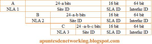 SLA ID (Site-Level Aggregation Identifier). El SLA es utilizado por una organización individual o final para crear su propia estructura jerárquica de direcciones e identificar sus subredes. Es equivalente al concepto de subred en IPV4. Dado que el tamaño del campo es de 16 bit las organizaciones pueden crear 65.536 (216) subredes. De la misma manera que con el NLA se puede escoger entre una estructura ‘plana’ o crear varios niveles según el siguiente esquema: